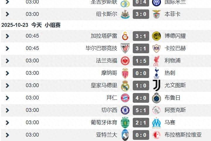 加拉塔萨雷3-1博德闪耀:奥斯梅恩双响,博德闪耀是主场人工草球队,客场战绩往往拉胯。毕尔巴鄂竞技3-1卡拉巴赫:古鲁泽塔双响,强弱分明的对决。法兰克福1-5利物浦:萨拉赫沦为替补,埃基蒂克弑旧主,维尔茨助攻双响,利物浦大胜终结四连败。摩纳哥0-0热刺:巴洛贡错失单刀,维卡里奥神扑救主,热刺客场带走1分已是好运。皇马1-0尤文图斯:两队门将都是门闩,贝林厄姆制胜,弗拉霍维奇错失单刀。拜仁4-0布鲁日:17岁前腰卡尔世界波,三大前锋凯恩&迪亚斯&杰克逊破门,左后卫莱默尔一人独造3球,攻防一体。切尔西5-1阿贾克斯:蓝军续写英超战力,19岁的吉乌和乔治破门,恩佐和埃斯特旺点射破门,客串右后卫的凯塞多建功,完全一边倒的比赛。葡萄牙体育2-1马赛:葡超劲旅击败法甲领头羊,上轮法甲大四喜格林伍德首发半场哑火被换下,法甲欧战还要看大巴黎。亚特兰大0-0布拉格斯拉维亚:奥迪隆错失单刀,卡内塞基精彩扑救,一场0-0闷平,但合计射门38脚(22-16),踢得热门,射术很差。意甲除了国际米兰,本轮欧冠都是送人童子。个人观点,2024欧洲杯扩军小组赛不好看了;如今欧冠改制球队多了,小组赛变成联赛阶段,比赛多了,弱旅多了,大比分多了,不好看了;2026世俱杯扩军小组赛肯定也不好看了……